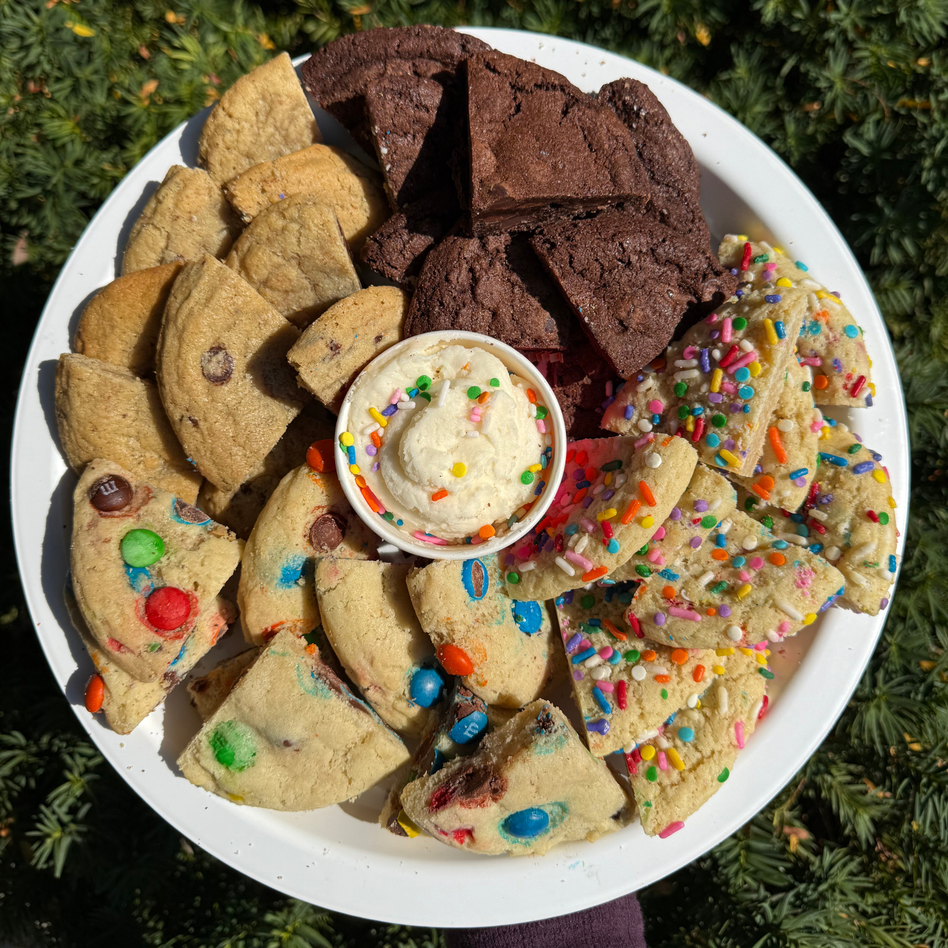 An assortment of our best selling handmade cookie flavors: chocolate chip, sugar sprinkle, milk chocolate mm and chocolate chocolate chunk cut into the perfect dipping size coupled with a large container of our homemade vanilla buttercream. You can’t beat the cookie +frosting combination. There is no sweeter way to end your Thanksgiving meal.